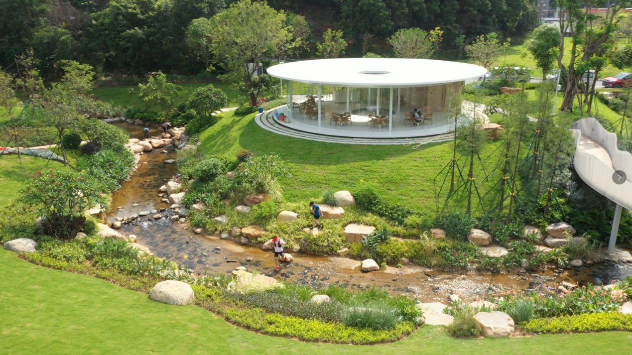 与工作站隔溪流相望是乡村会客厅,它是一个小巧的环形建筑,宽大的屋顶和透明的外立面使其很好的与环境景观相融合,成为一个新式的亭。