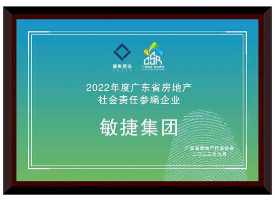 今年9月,敏捷集团作为优秀房企代表,获颁“广东省房地产行业社会责任参编企业”牌匾,被纳入《2022年度广东省房地产企业社会责任报告》优质案例,将过去一年在乡村振兴、公益慈善、助推城市建设、客户服务等方面的实践与成果全面展现。